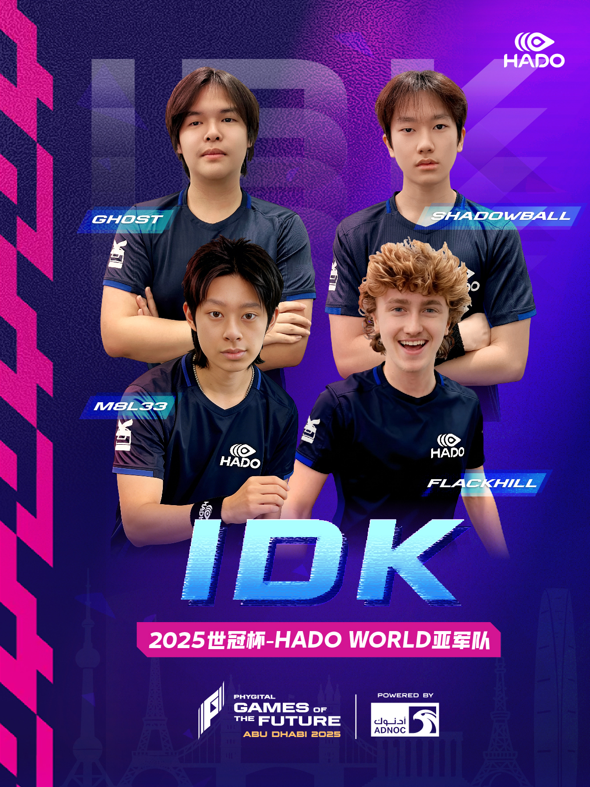 IDK是英国赛场上最具统治力也最具历史的俱乐部之一。自2019年成立以来,队伍在多赛季中横扫所有英国锦标赛、全国联赛与地区赛事,并自2025 年起被任命为HADO USA官方大使队伍。