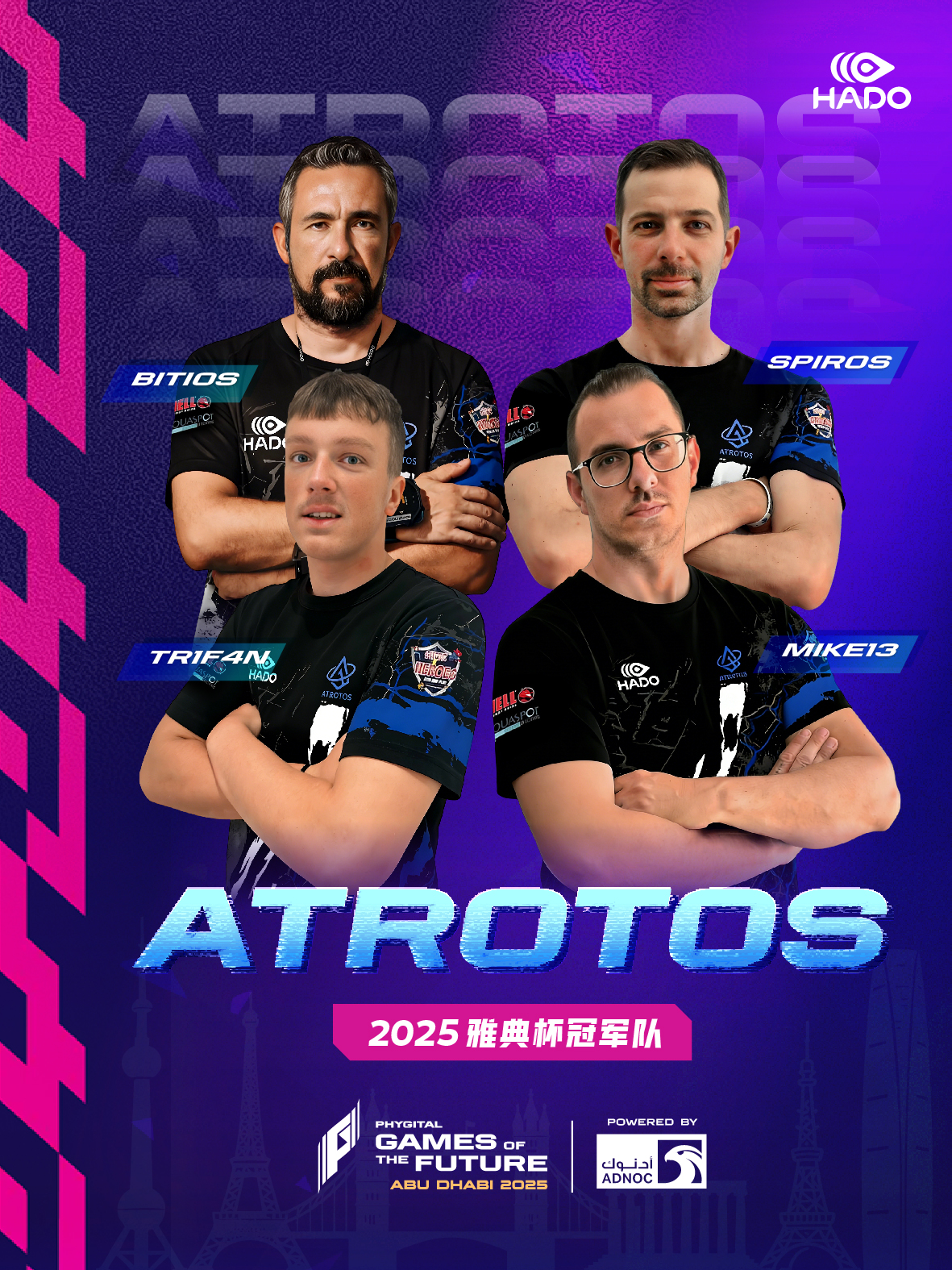 ATROTOS 作为欧洲最具成绩的 HADO 俱乐部之一,也是希腊领先的专业训练机构,将亮相The Games of the Future 2025。球队在国内外拥有强劲战绩,多次参加HADO WORLD CUP与HADO EURO CUP,并多次夺得 HADO National Cup 冠军。