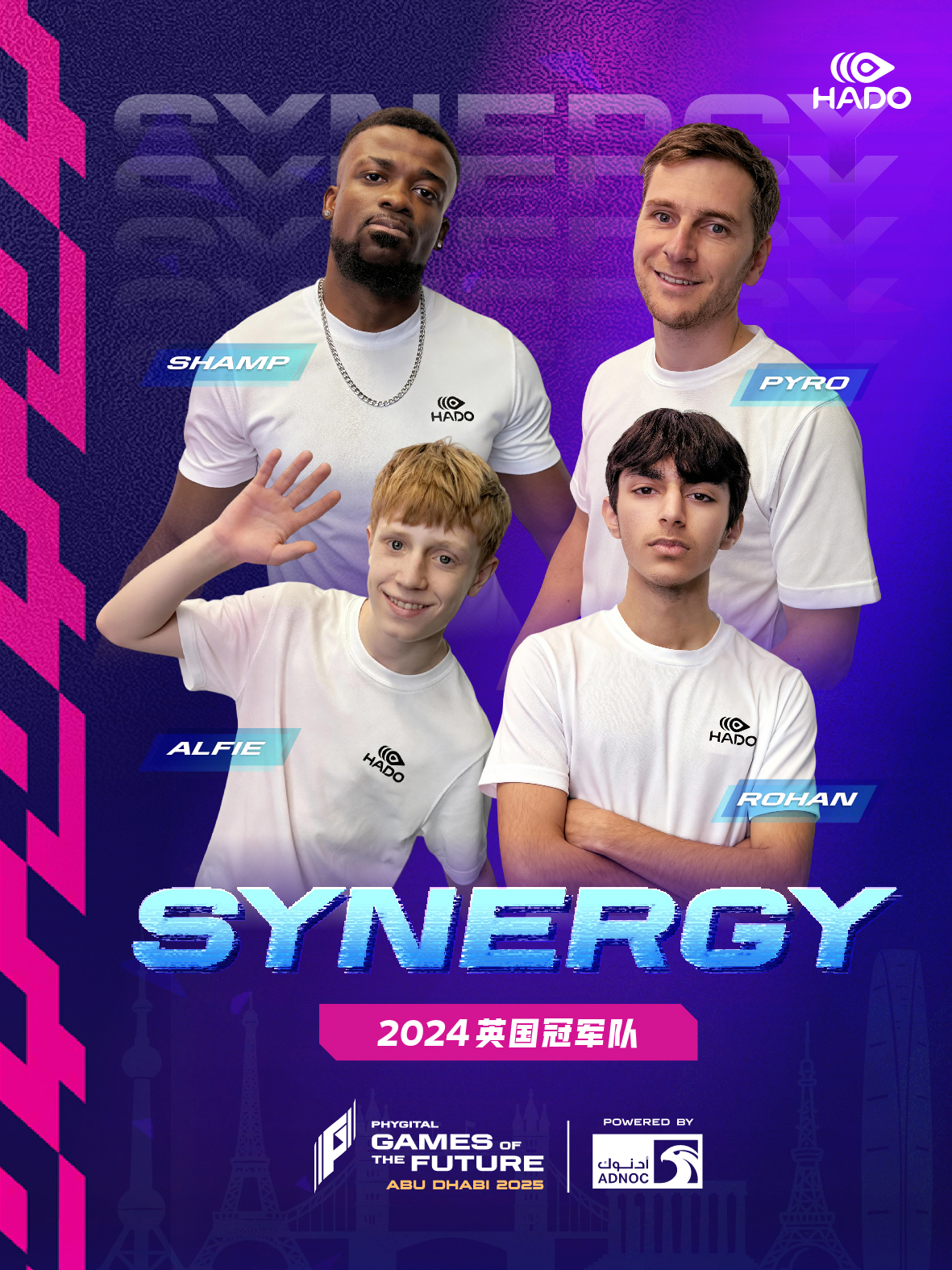 Synergy是欧洲赛区最具战术深度的俱乐部之一,成员亦组成英国国家队。队伍在多届 HADO WORLD CUP、欧洲锦标赛、以及 Home Nations Championship 中累积大量大赛经验。