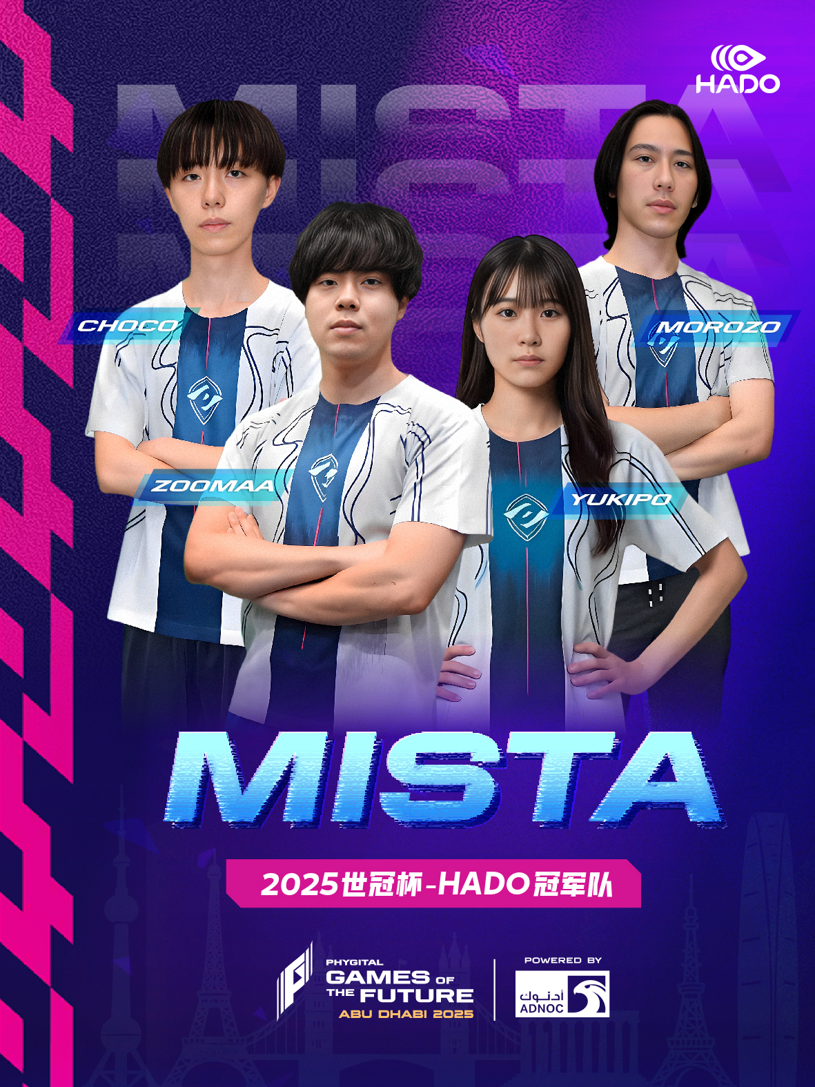 MISTA 长期在全球各大 HADO 赛事中培养并输送顶尖选手,以强大的战术素养和稳定的竞技表现著称。本次出战肩负高度期待。